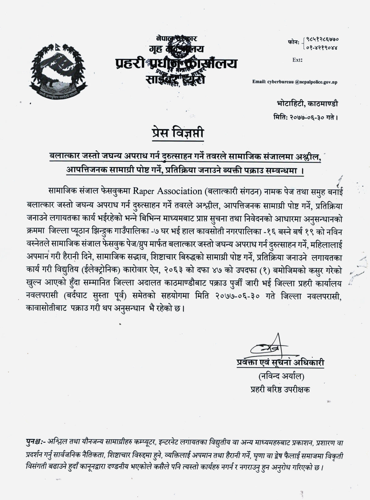 सामाजिक सञ्जाल फेसबुकमा बलात्कारी समूह (रेपर एसोशिएसन) बनाउने व्यक्तिलाई प्रहरीले पक्राउ गरेको छ । नेपाल प्रहरीको साइबर ब्यूरोले सामाजिक सञ्जाल फेसबुकमा बलात्कारी संगठन नामक पेज र समूह बनाउने नवीन बस्नेतलाई पक्राउ गरेको हो ।