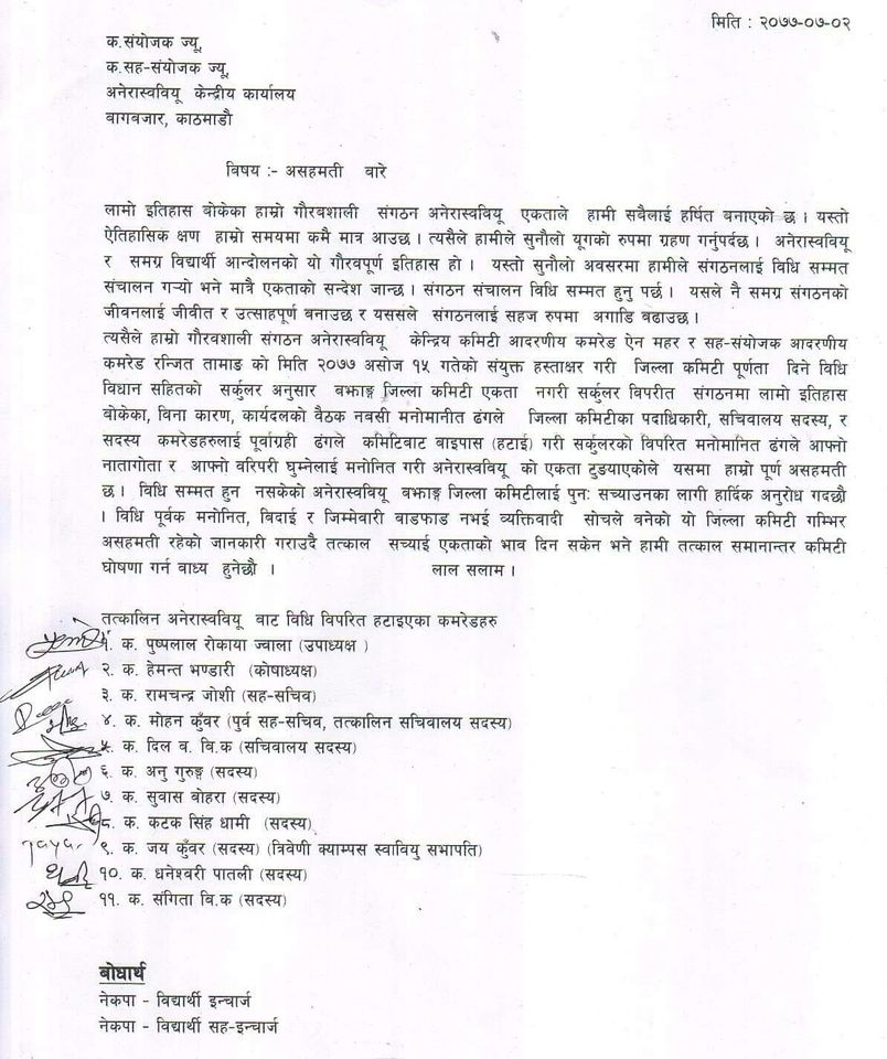 तत्कालीन उपाध्यक्ष, कोषध्यक्ष, सहसचिव, पुर्ब सचिब, सचिवालय सद्स्य लगाएतका ११ जना नेताले हस्ताक्षर गर्दै केन्द्रिय संयोजक एन महर र सह संयोजक रन्जित तामाङलाई एकलौटी रुपमा बिस्तार गरिएको कमिटी नसच्चिए समानान्तर कमिटी घोषणा गर्ने चेतावनी सहितको असमती पत्र बुझाएका छ्न ।