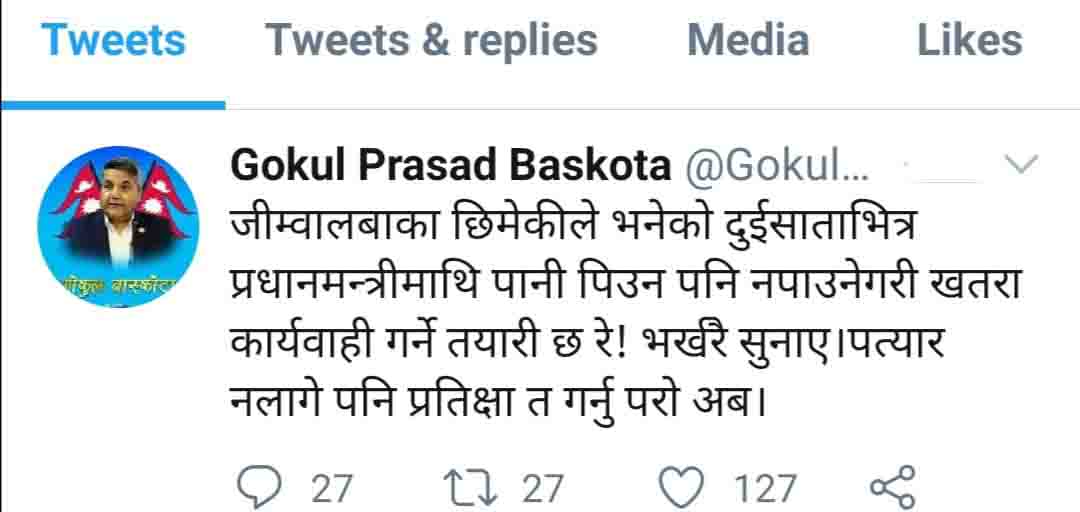 ‘जिम्वालबाका छिमेकीले भनेको दुईसाताभित्र प्रधानमन्त्रीमाथि पानी पिउन पनि नपाउनेगरी खतरा कार्यवाही गर्ने तयारी छ रे,’ बाँस्कोटाले मंगलबार ट्वीट गर्दै भनेका छन्, ‘भर्खरै सुनाए । पत्यार नलागे पनि प्रतिक्षा त गर्नु परो अब ।’