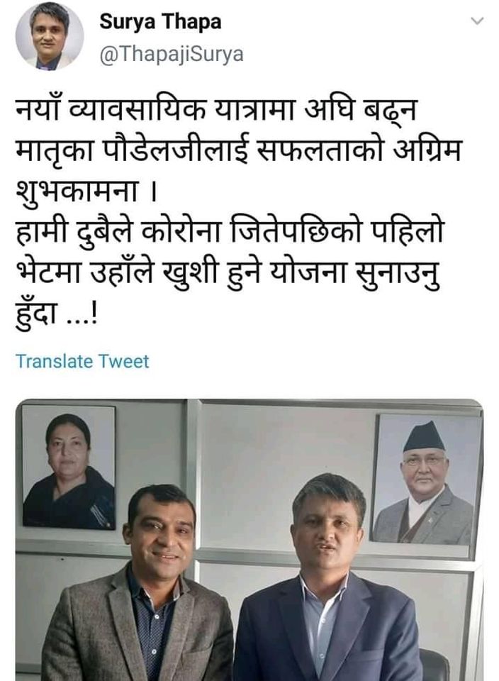 ‘नयाँ व्यावसायिक यात्रामा अघि बढ्न मातृका पौडेलजीलाई सफलताको अग्रिम शुभकामना,’ ट्वीटमा लेखिएको छ–‘हामी दुवैले कोरोना संक्रमण जितेपछिको पहिलो भेटमा उहाँले खुशी हुने योजना सुनाउनु हुँदा दुवै जना दंग….!’
