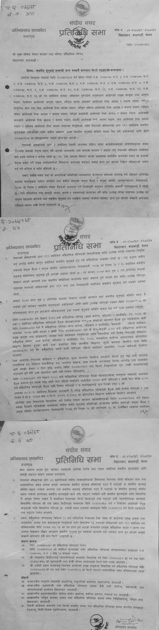 तर ५ पुसमा प्रतिनिधिसभा भंग गरेसँगै अख्तियार, निर्वाचन आयोग लगायतका संवैधानिक अंगहरुमा नियुक्ति सिफारिस गरेको भन्दै संसद सचिवालयमा पत्र पुगेको थियो ।