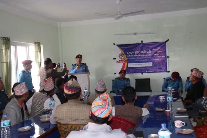 जिल्ला प्रहरी कार्यालयहरुको निरीक्षण भ्रमणको सिलसिलामा जिल्ला प्रहरी कार्यालय खोटाङ पुग्नु भएका प्रदेश प्रहरी प्रमुख खापुङले जिल्लाका स्थनिय नागरिक, जनप्रतिनिधिहरु, बिभिन्न संघ संस्थाका प्रमुख, जेष्ठ नागरिक, महिला संजाल, पूर्व प्रहरी कर्मचारीहरु, संचारकर्मी तथा स्थानिय भद्रभलाद्मीहरुसंग जिल्लाको शान्तिसुरक्षाको अवस्था, शान्तिसुरक्षाको निम्ति प्रहरीद्वारा निर्वाह गर्नु पर्ने भुमिका, प्रहरीसंग स्थानिय बासीको अपेक्षा तथा प्रहरी र स्थानियबासी बिचको सम्वन्ध साथै अपराध नियन्त्रणको लागि नागरिकहरुबाट प्रहरीलाई उपलव्ध हुनु पर्ने सहयोग लगायतका विविध बिषयमा अन्तरक्रिया तथा छलफल गर्नु भएको थियो ।