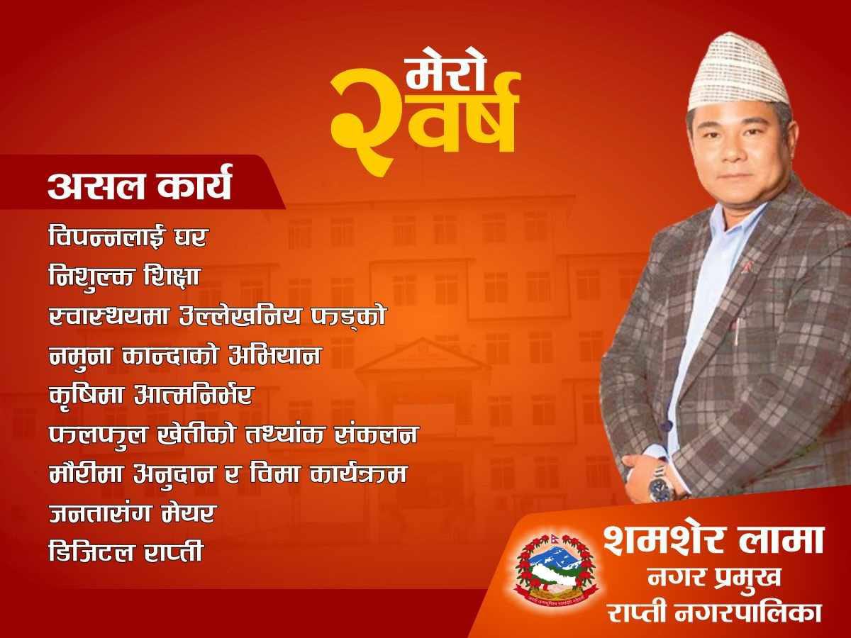 राप्ती । चितवनको राप्ती नगरपालिकामा मेयर शमशेर लामाले नेतृत्व गरेको दुई बर्ष पुरा भएको छ । दुई ठुला दल नेपाली काँग्रेस र एमालेका जनप्रतिनिधिहरुको अबरोध छिचोल्दै उनले नगरको विकासमा उपलब्धि हासिल गरेको दावी गरेका छन् । उनले नेतृत्व सुरु गरेपछि नगरको मुहार फेरिन सुरु भएको उनको भनाई छ ।