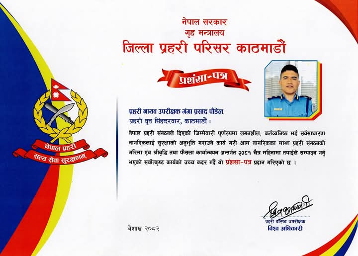 २०८१ चैत्र महिनामा फैसला कार्यान्वयन अन्तर्गत सर्वोत्कृष्ट हुन सफल प्रहरी वृत्त सिंहदरबारका प्रमुख प्रहरी नायव उपरीक्षक गंगा प्रसाद पौडेल लाई सम्पादन गर्नुभएको सर्वोत्कृष्ट कार्यको उच्च कदर गर्दै काठमाडौँ प्रहरी प्रमुख एसएसपी विश्व अधिकारीले प्रशंसा पत्र प्रदान गरेका हुन् ।