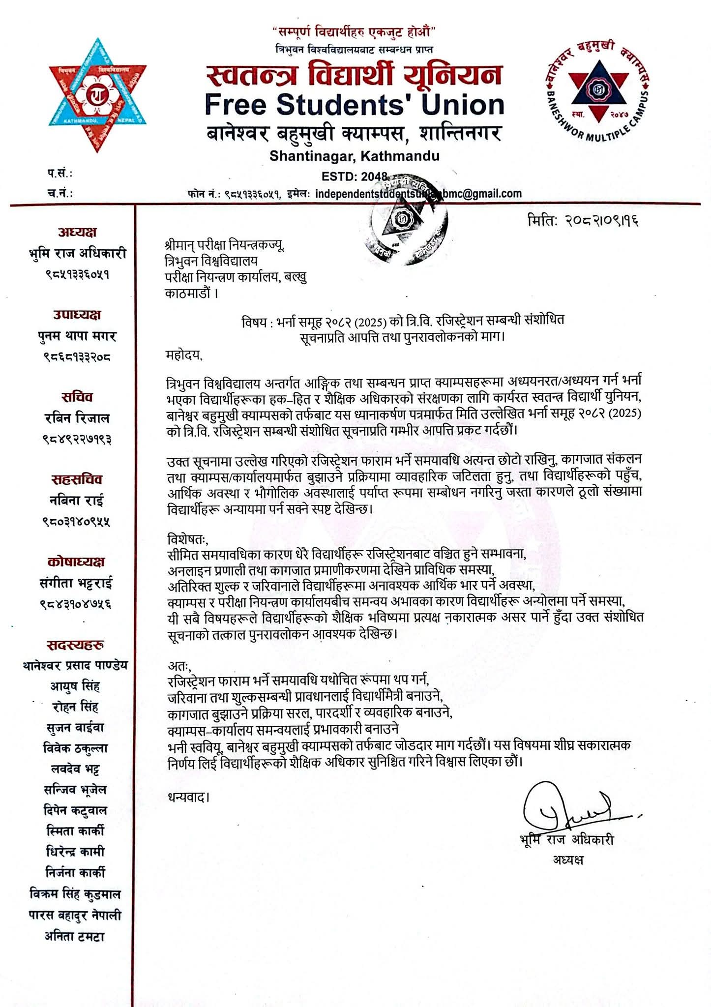 समग्र विद्यार्थीको हितलाई केन्द्रमा राख्दै स्ववियू बानेश्वर बहुमुखी क्याम्पसले केही दिनअघि, पौष १६ गते, सहायक परीक्षा नियन्त्रक डा. दावा शेर्पालगायत सम्बन्धित निकायहरूसमक्ष संशोधित सूचनाप्रति आपत्ति जनाउँदै स्ववियु बानेश्वर बहुमुखी क्याम्पसका अध्यक्ष भुमिरा अधिकारीले पुनरावलोकनको मागसहित मागपत्र बुझाएका थिए।