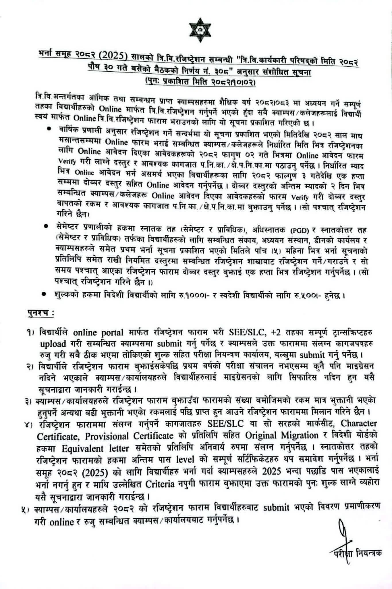 त्रिभुवन विश्वविद्यालयले रजिस्ट्रेशन फारम भर्ने समयावधि माघ मसान्तसम्म कायम गर्ने निर्णय