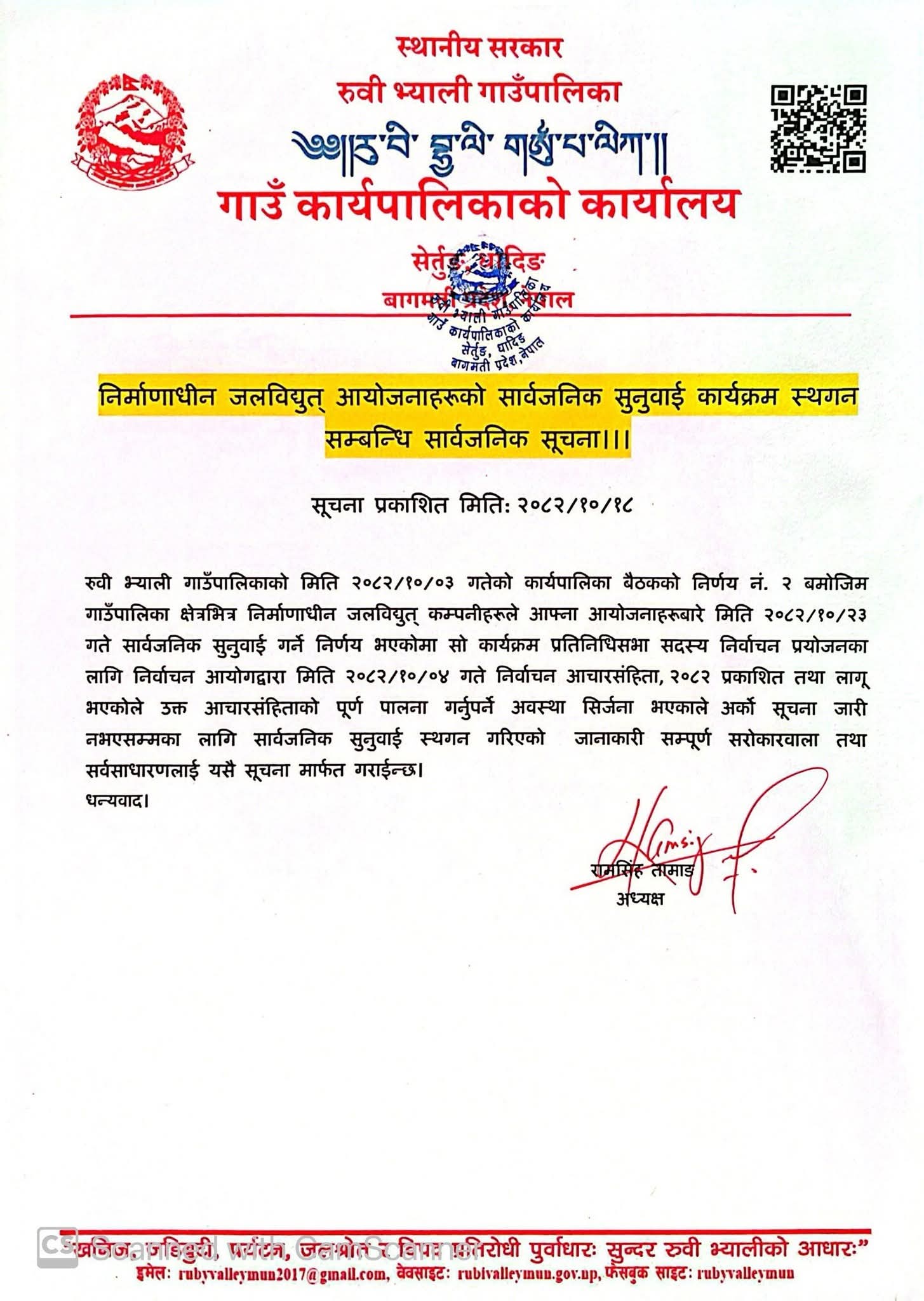 गाउँपालिकाका अध्यक्ष रामसिंह तामाङद्वारा जारी सूचनामा सार्वजनिक सुनुवाइ स्थगनसम्बन्धी जानकारी सम्पूर्ण सरोकारवाला निकाय तथा सर्वसाधारणलाई गराइएको उल्लेख गरिएको छ ।