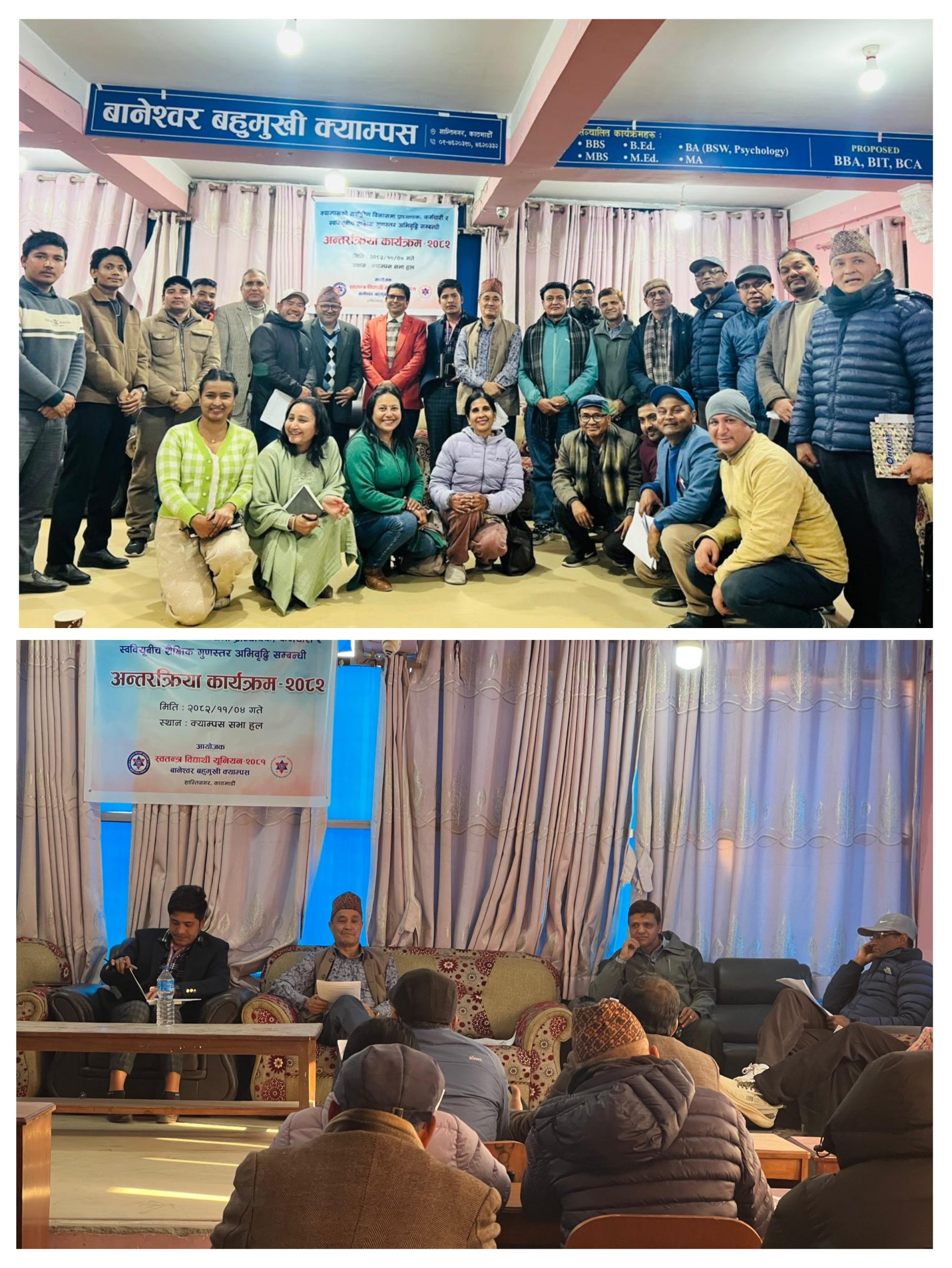 बानेश्वर बहुमुखी क्याम्पसको समग्र शैक्षिक गुणस्तर अभिवृद्धि तथा अध्ययन–अध्यापन प्रक्रियालाई थप प्रभावकारी, व्यावहारिक र व्यवस्थित बनाउने उद्देश्यले स्वतन्त्र विद्यार्थी युनियन (स्ववियु) को आयोजनामा महत्वपूर्ण अन्तरक्रिया कार्यक्रम सम्पन्न भएको हाे।